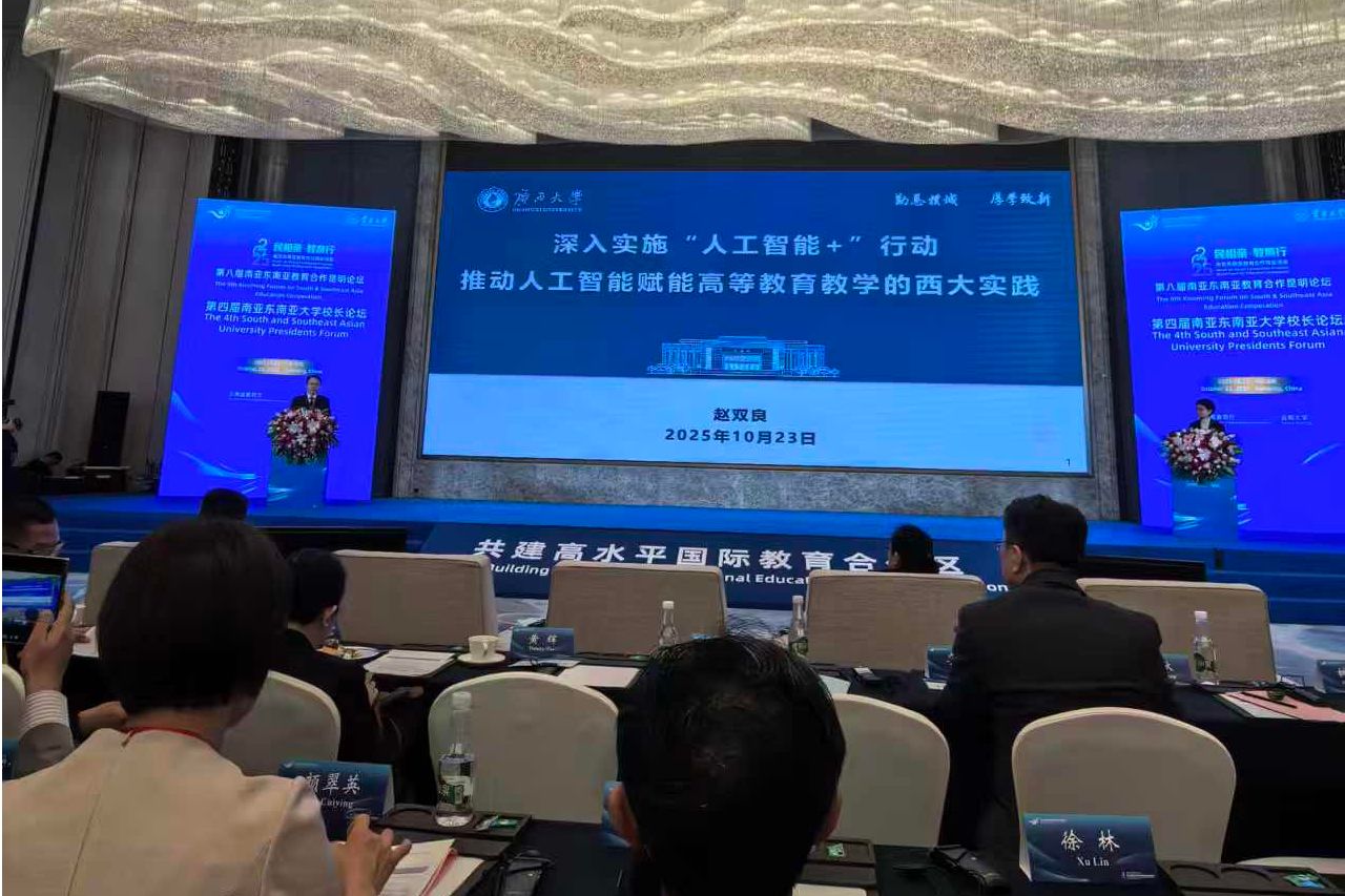 On October 23, Guangxi University (GXU) was invited to attend the 8th Kunming Forum on South and Southeast Asia Education Cooperation and the 4th South and Southeast Asian University Presidents' Forum. Zhao Shuangliang, Vice President of GXU, was invited to participate and delivered a thematic report titled "Thoroughly Implementing the 'AI Plus' Initiative: GXU's Practices in Promoting AI-Empow...