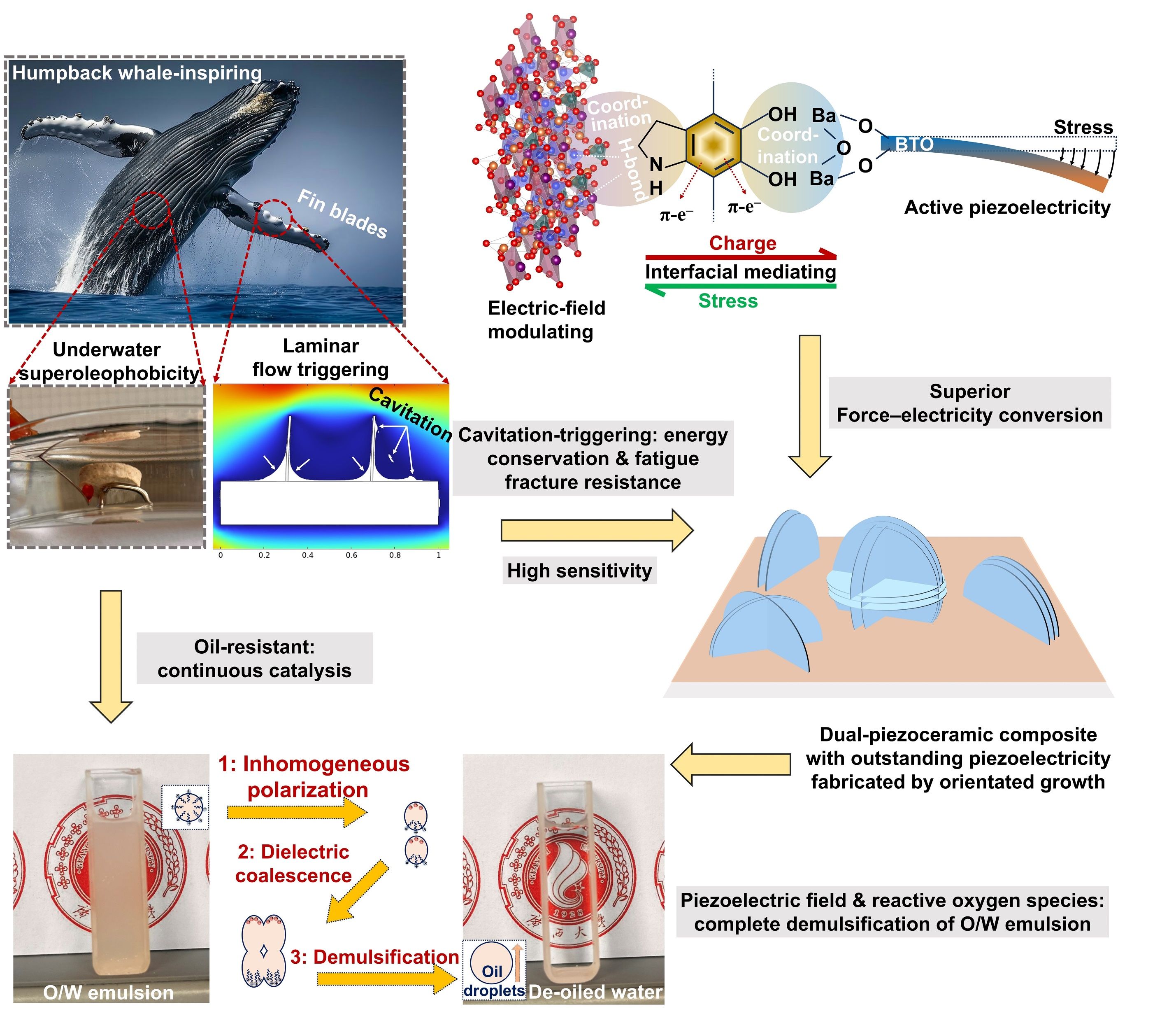 Safe and sustainable piezocatalytic technology holds broad application prospects in the field of water purification. However, the inherent rigidity of piezoceramics makes achieving excellent piezocatalytic efficiency quite challenging, as the process typically requires substantial energy consumption and presents a risk of fatigue fracture in the piezoceramics. To address this, the team drew inspiration from the irregular nodules on the leading edge of a humpback whale's pectoral flippers, which create cavitation effects and flow vortices in turbulent water. Using eco-functional Nixing Pottery, which possesses spontaneous polarization properties, as the base material, they synthesized a super-wetting dual-piezoelectric composite material with high force-electric sensitivity. This was achieved by directionally growing barium titanate after biomimetic modification with polydopamine. Under gentle mechanical force triggering, this biomimetic composite material generated a key cavitation effect. The coordination action of polydopamine enabled efficient stress and charge transfer between the eco-functional Nixing Pottery and barium titanate. Consequently, the composite material exhibited an excellent piezoelectric response, generating a localized piezoelectric field of 1.46×10⁹ V/m and reactive oxygen species, thereby avoiding fatigue fracture and high energy consumption. Using ordinary stirring as the mechanical force, the material achieved complete demulsification of an oil-in-water emulsion within 15 minutes through electric field polarization of oil droplets and degradation of the emulsifier by reactive oxygen species, demonstrating a performance 3.3 to 4.0 times superior to comparative catalysts. This strategy enables sustainable and efficient demulsification, showing significant application potential for the large-scale purification treatment of oily wastewater.