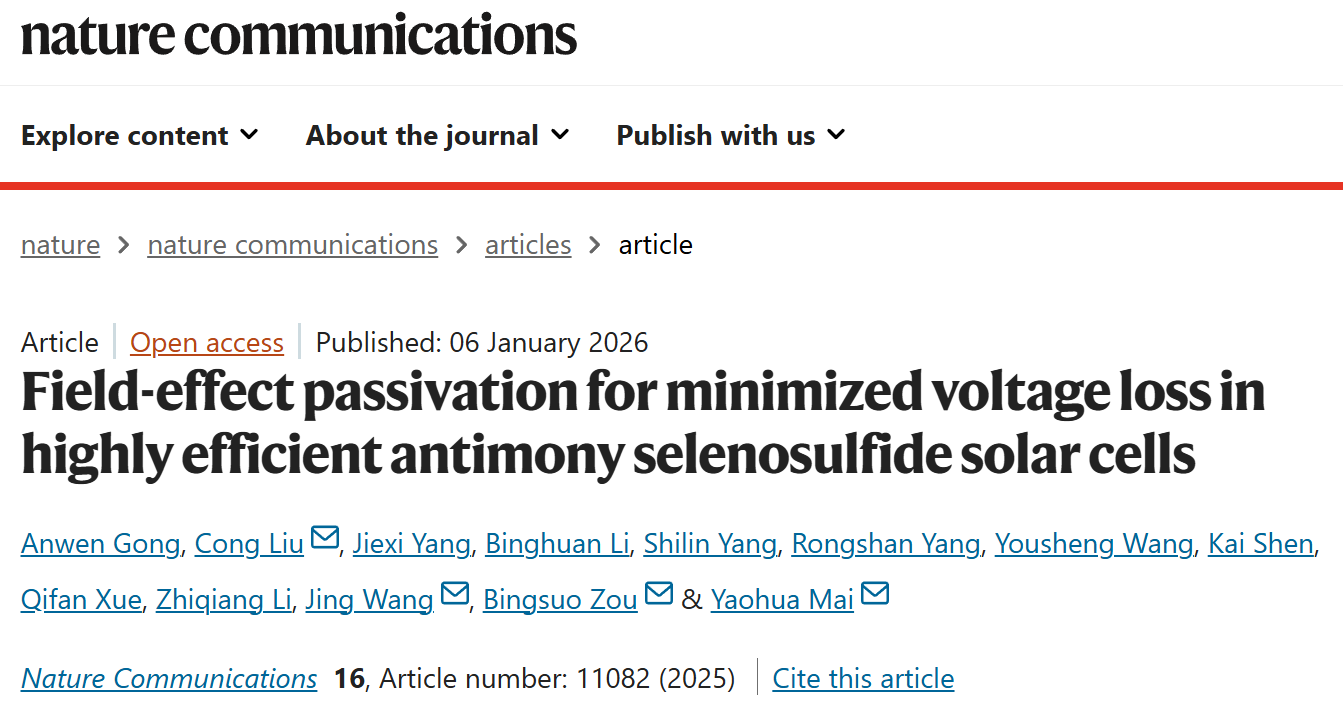 Recently, the Nano Photonics Materials and Technology Team at GXU has made new progress in the field of antimony selenosulfide (Sb₂(S,Se)₃) solar cells. The relevant achievements have been published in Nature Communications under the title “Field-effect passivation for minimized voltage loss in highly efficient antimony selenosulfide solar cells”. Anwen Gong, a doctoral student of the class of 2025 at the School of Resources, Environment and Materials, is the first author of the paper. The corresponding authors are Professor Bingsuo Zou and Assistant Professor Cong Liu from the School of Resources, Environment and Materials, Professor Yaohua Mai from Jinan University, and Associate Professor Jing Wang from Guangdong University of Technology. Guangxi University is the primary institution responsible for this work.