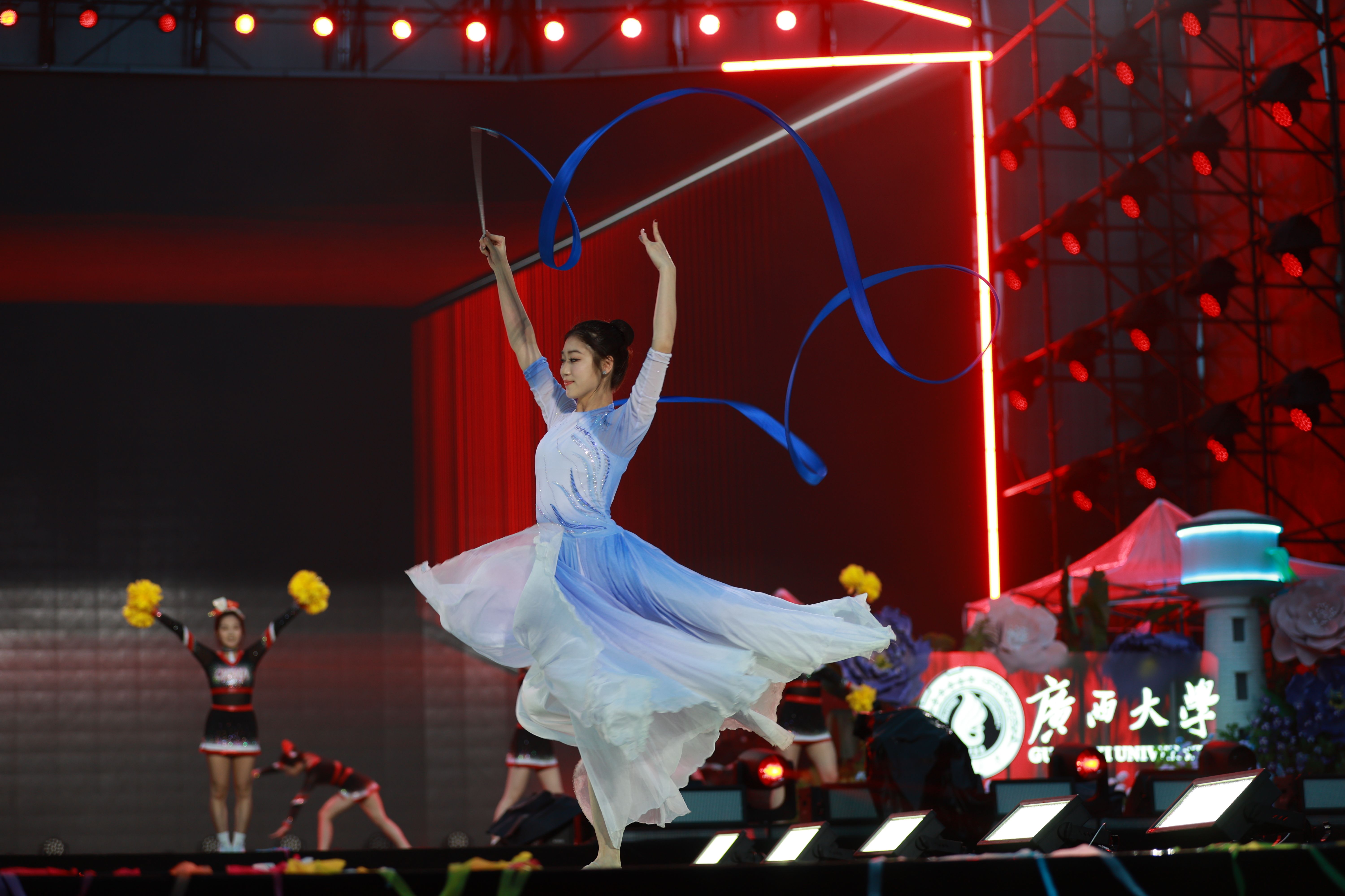 Renowned guests including Hu Yanbin, JA Fu Longfei, R.E.D, Wang Aonan EVE, and Yang Huaju were invited to the stage, performing alongside Guangxi University students and continuously elevating the atmosphere. Ethnic cultural masterpieces such as Cai Diao · Bronze Bird Forest, Song of the Earth, and Dong Ethnic Chorus, meticulously guided by faculty from our School of Arts, made splendid appearances. These performances inherited the cultural heritage of Guangxi through youthful expressions, vividly demonstrating the solid achievements in aesthetic education and the transmission of outstanding traditional culture in GXU.