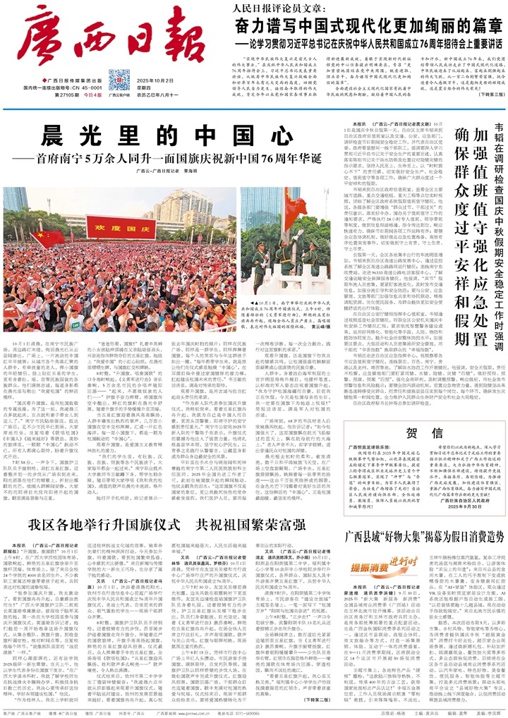 本报讯 (广西云-广西日报记者顾醒航)“升国旗,奏国歌!”10月1日上午8时,在广西大学西校园体育场,国歌响起,鲜艳的五星红旗徐徐升至旗杆顶端。体育场上,除了来自全校24个学院的4000余名师生外,不少教职工家属还特意带着孩子赶来,共同表达对祖国的诚挚祝福。