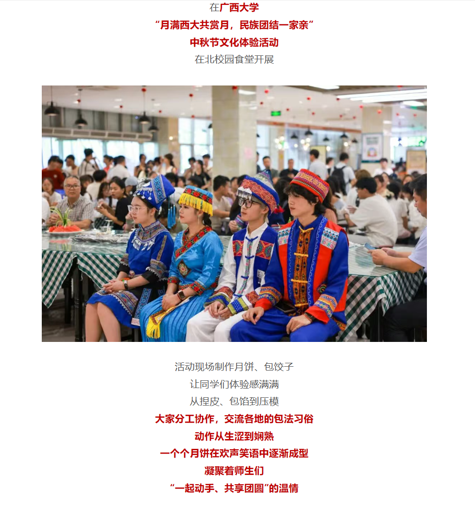 近日,以“月满西大共赏月,民族团结一家亲”为主题的中秋节文化体验活动在广西大学北校园食堂开展。该活动由共青团广西大学委员会组织,获共青团中央报道,部分报道内容如下: