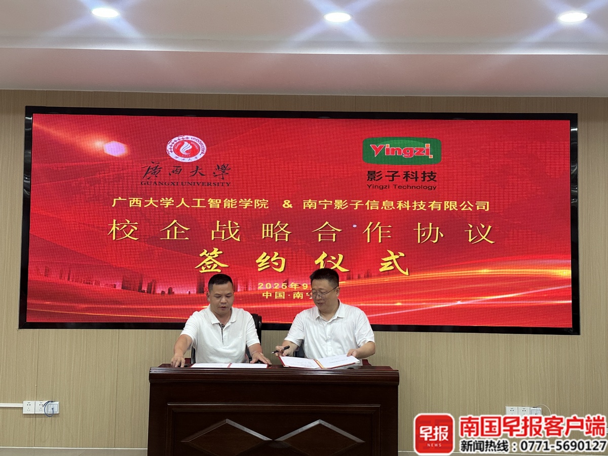9月29日,广西大学人工智能学院与南宁市影子信息科技有限公司(以下简称影子科技)正式签订校企战略合作协议。双方将以“优势互补、资源共享”为核心,围绕人才培养、科研创新两大重点方向深化合作,并共同建设学习实践基地,推动高校教育资源与企业产业资源深度融合。