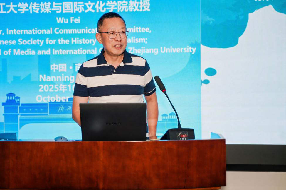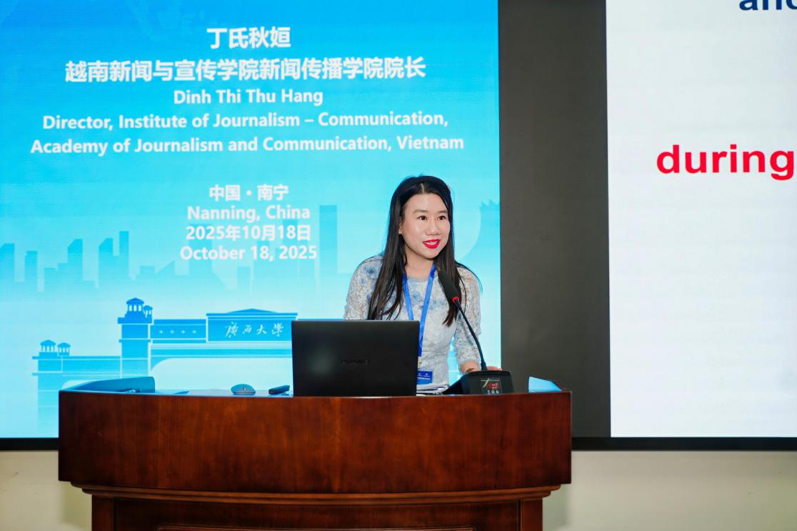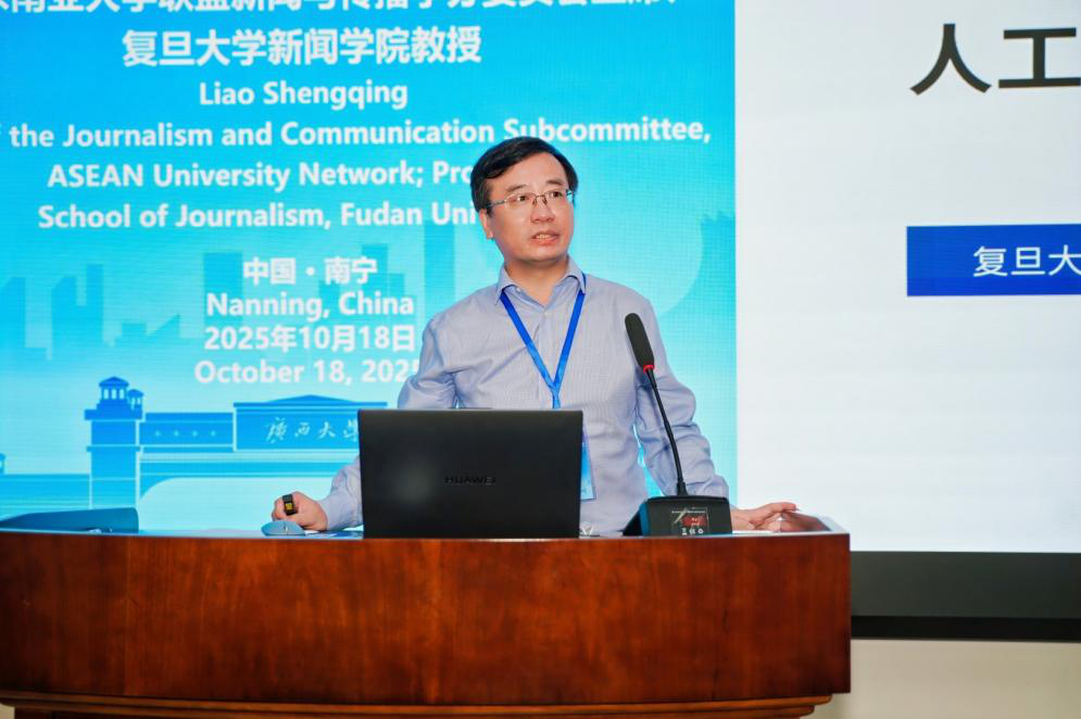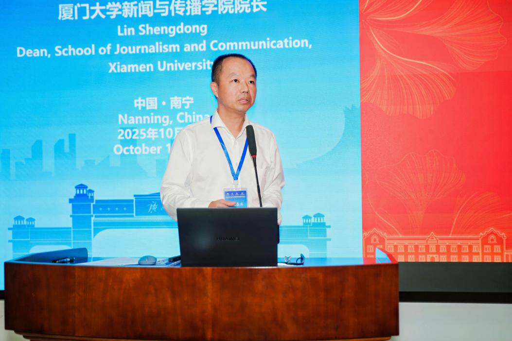 赵双良在致辞中强调了中国与东盟的友好关系,总结了广西大学围绕人工智能与强化东盟办学特色采取的办学举措,回顾了广西大学新闻教育历史。他指出,广西大学将以本次论坛为起点,持续推进研究范式创新、人才培养提质与成果转化落地,培养能够驾驭智能科技、坚守人文价值、致力于推动中国—东盟命运共同体建设的卓越新闻传播人才。
