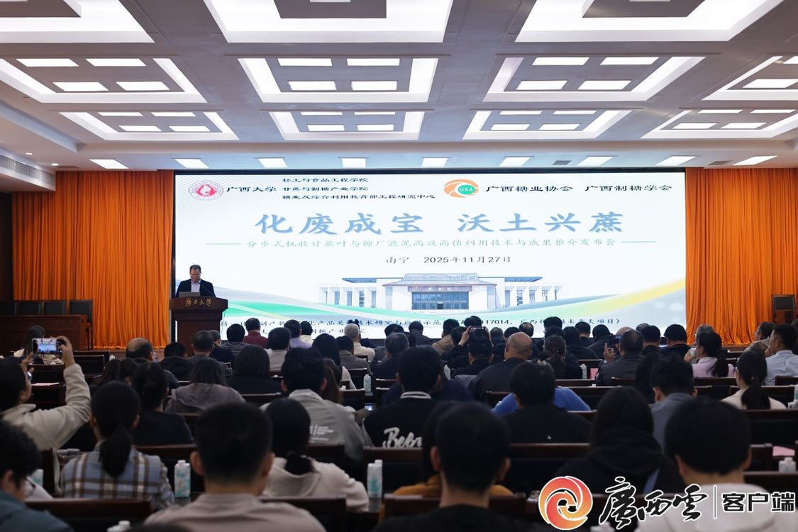 11月27日,以“科技赋能、助力机收”为主题的“分步式机收甘蔗叶与糖厂滤泥高效高值利用”技术与成果推介发布会在广西大学举行。发布会由广西大学轻工与食品工程学院、甘蔗与制糖产业学院、糖业及综合利用教育部工程研究中心、广西糖业协会和广西制糖学会联合主办,来自相关政府部门、行业协会、高校、制糖企业负责人和代表共100余人参会。