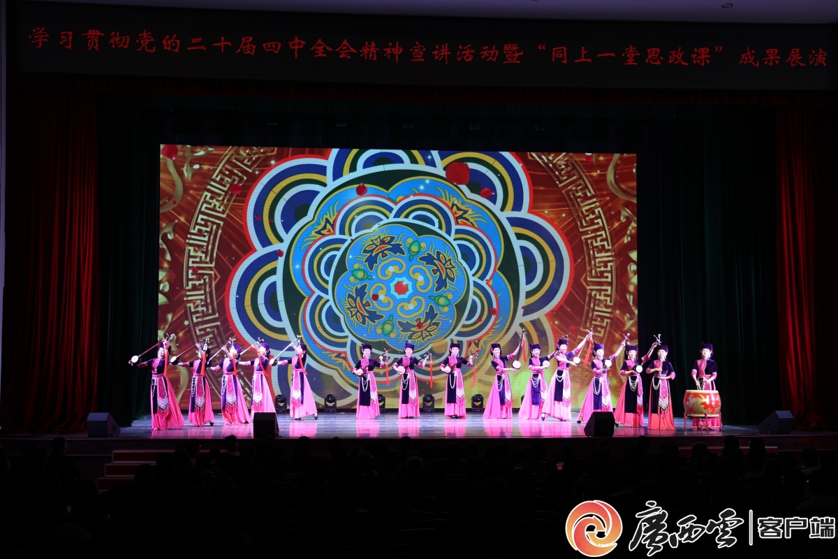 12月10日晚,广西大学和西乡塘区共同主办的学习贯彻党的二十届四中全会精神宣讲活动暨“同上一堂思政课”成果展演在广西大学西校园礼堂举行。展演活动以“立德树人 坚守使命”“守正创新 探索实践”“聚焦基层 凝心聚力”“联动共建 融合共通”为主线,生动展示了思政课教师队伍建设、案例征集和创作工作、优秀宣讲员风采及思政平台联建成效。
