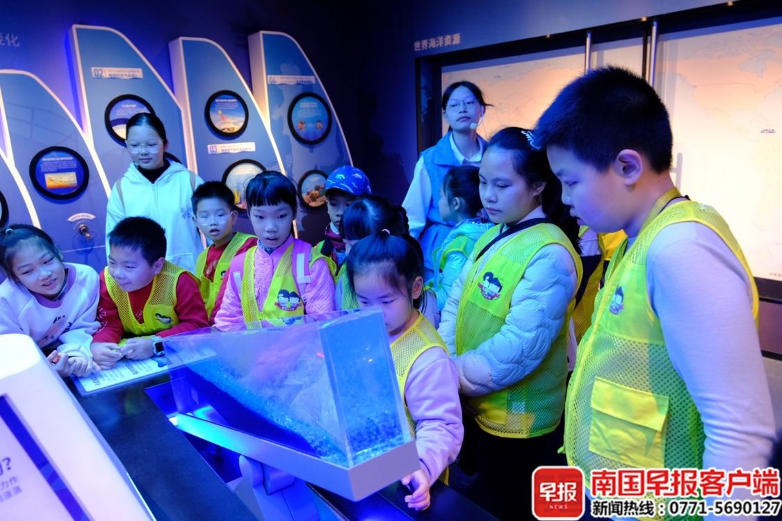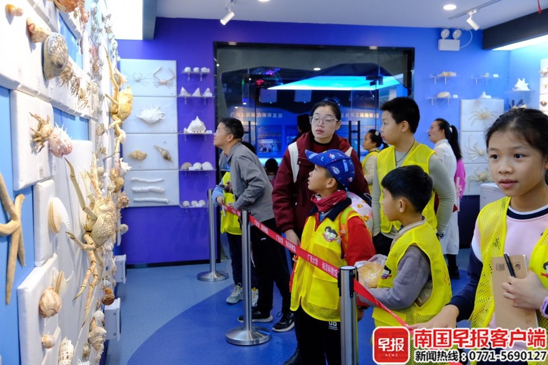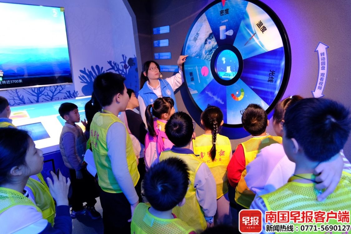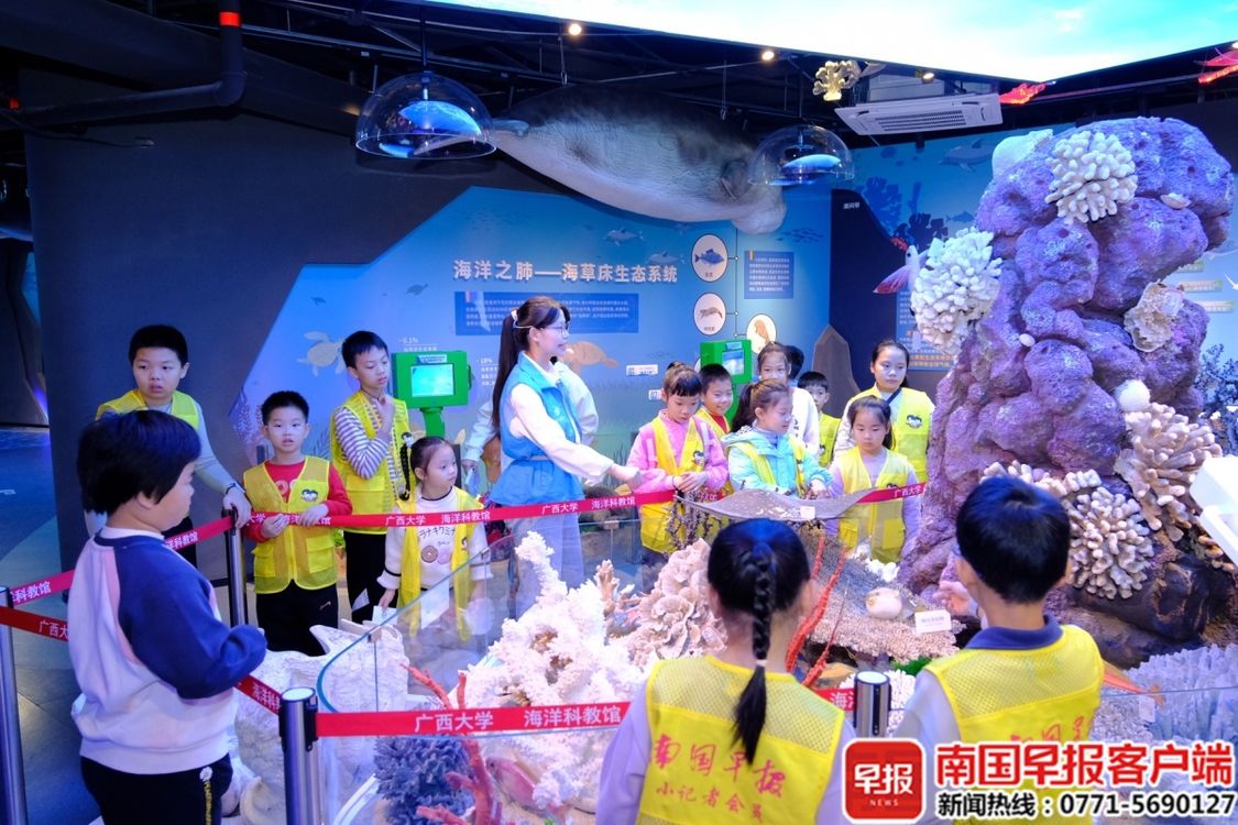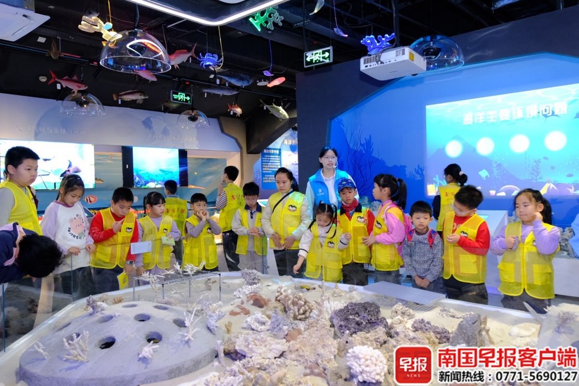 12月28日,二十余组南国小记者亲子家庭齐聚广西大学海洋学院海洋科教馆,在专业讲解老师的带领下开启了一场沉浸式的海洋探索之旅。