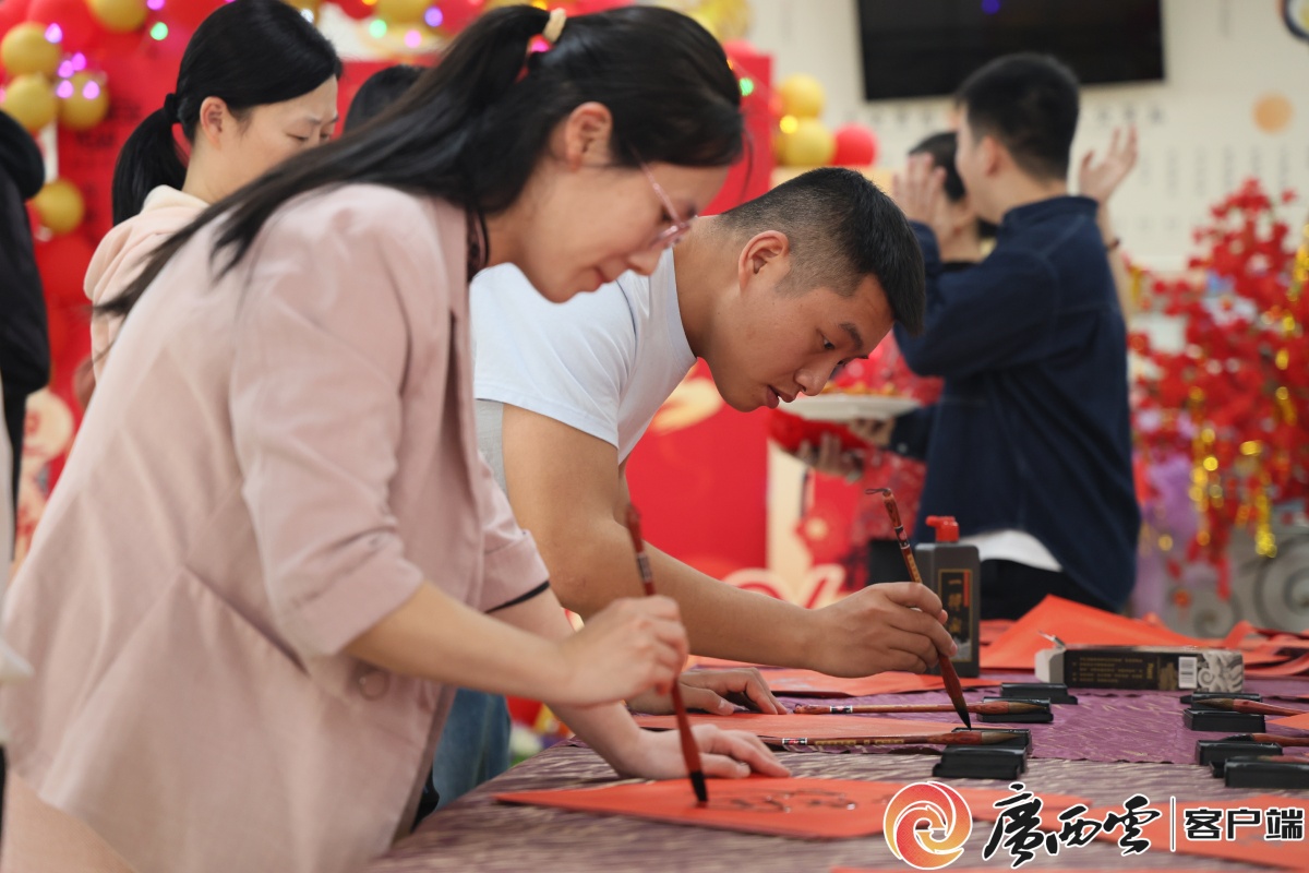 当天,广西大学萃苑餐厅一楼年味浓浓,160余名留校学生与老师们齐聚一堂。活动现场,校长肖建庄提笔写下“福”字,并和副校长赵双良一起,代表学校为留校过年的同学们送上“春节红包”和“福袋”。师生们剪窗花、包饺子、吃年夜饭,在校园里共庆新春。