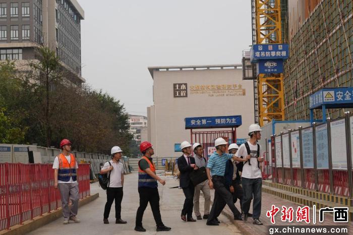 在综合实验中心施工现场,广西大学土木建筑工程学院应敬伟博士向中外学者详细介绍了该项目技术核心“再生混凝土”的应用细节。