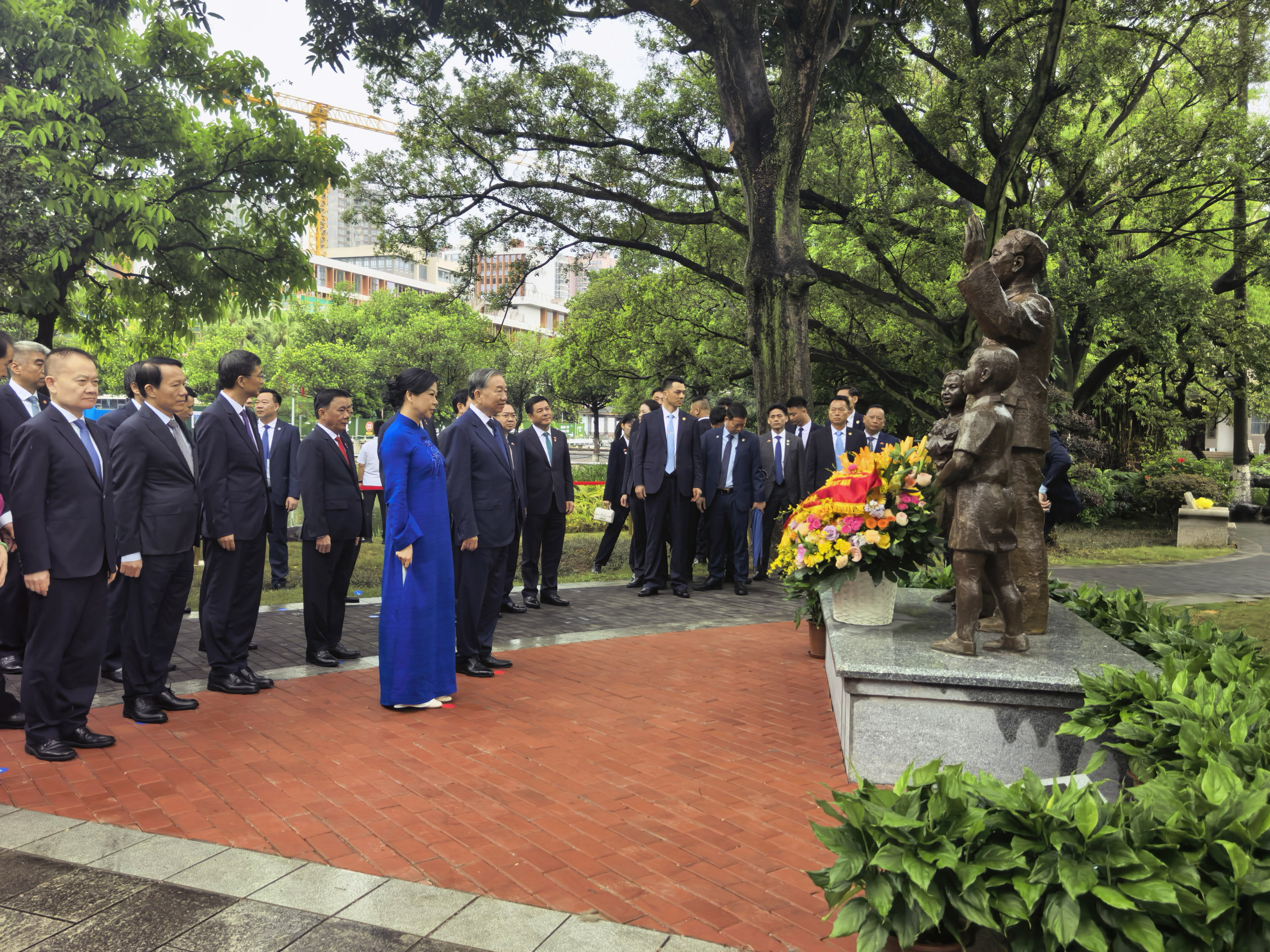 4月17日,越共中央总书记、国家主席苏林到访广西大学,瞻仰《胡志明和孩子们》铜像。中新社记者 杨陈 摄