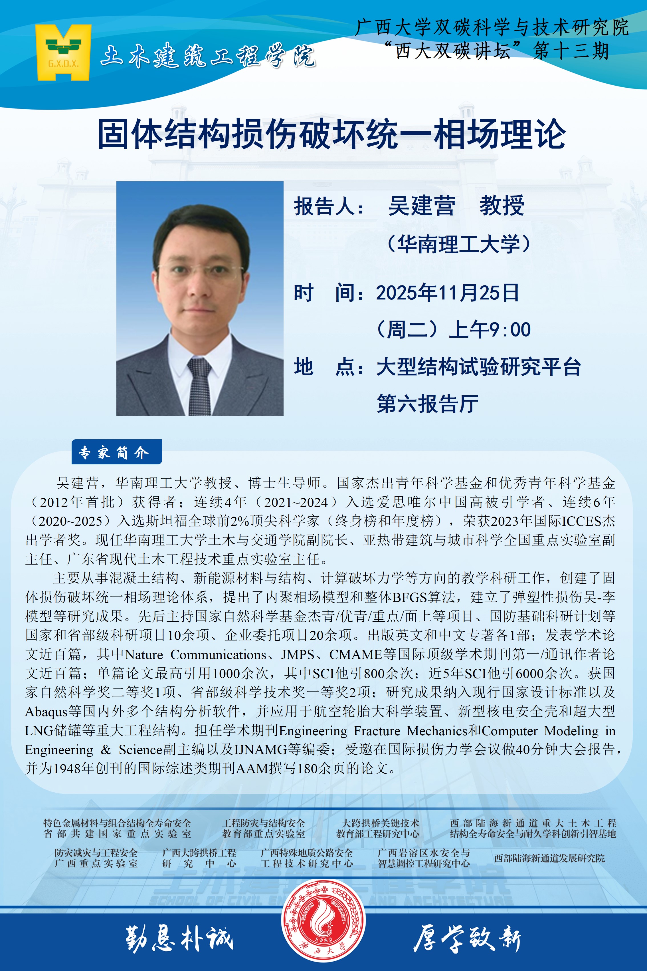 土木建筑工程学院、广西大学双碳科学与技术研究院学术报告:固体结构损伤破坏统一相场理论