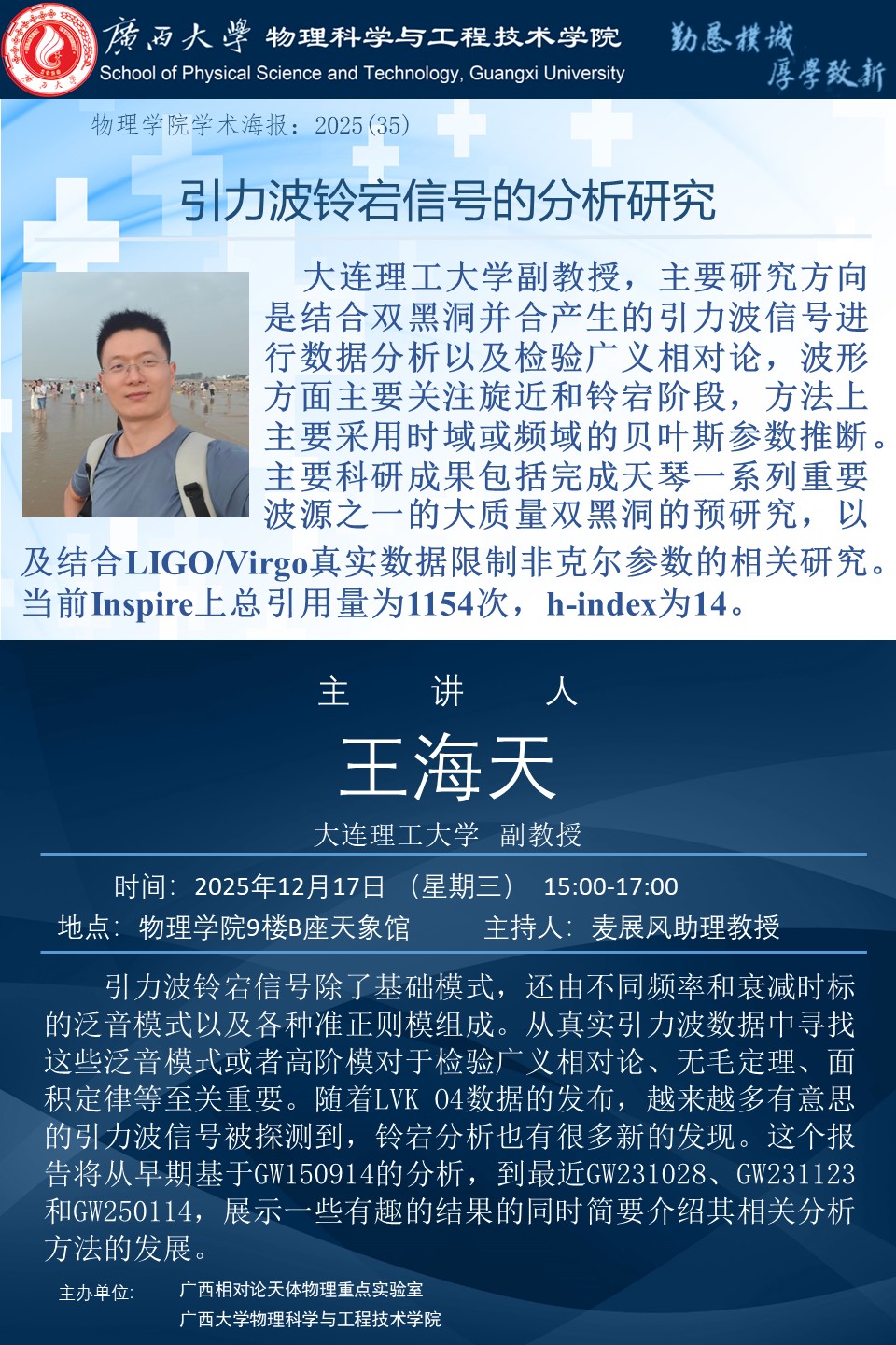 物理科学与工程技术学院学术报告: 引力波铃宕信号的分析研究