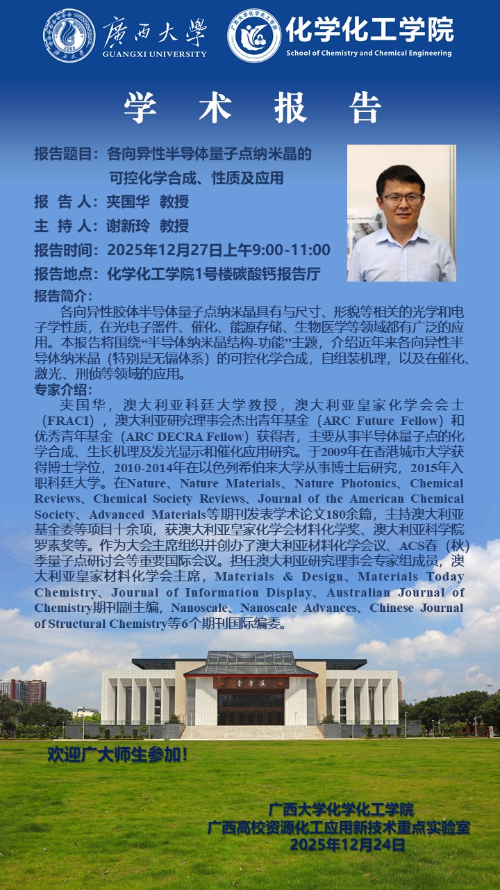 化学化工学院学术报告:各向异性半导体量子点纳米晶的可控化学合成、性质及应用