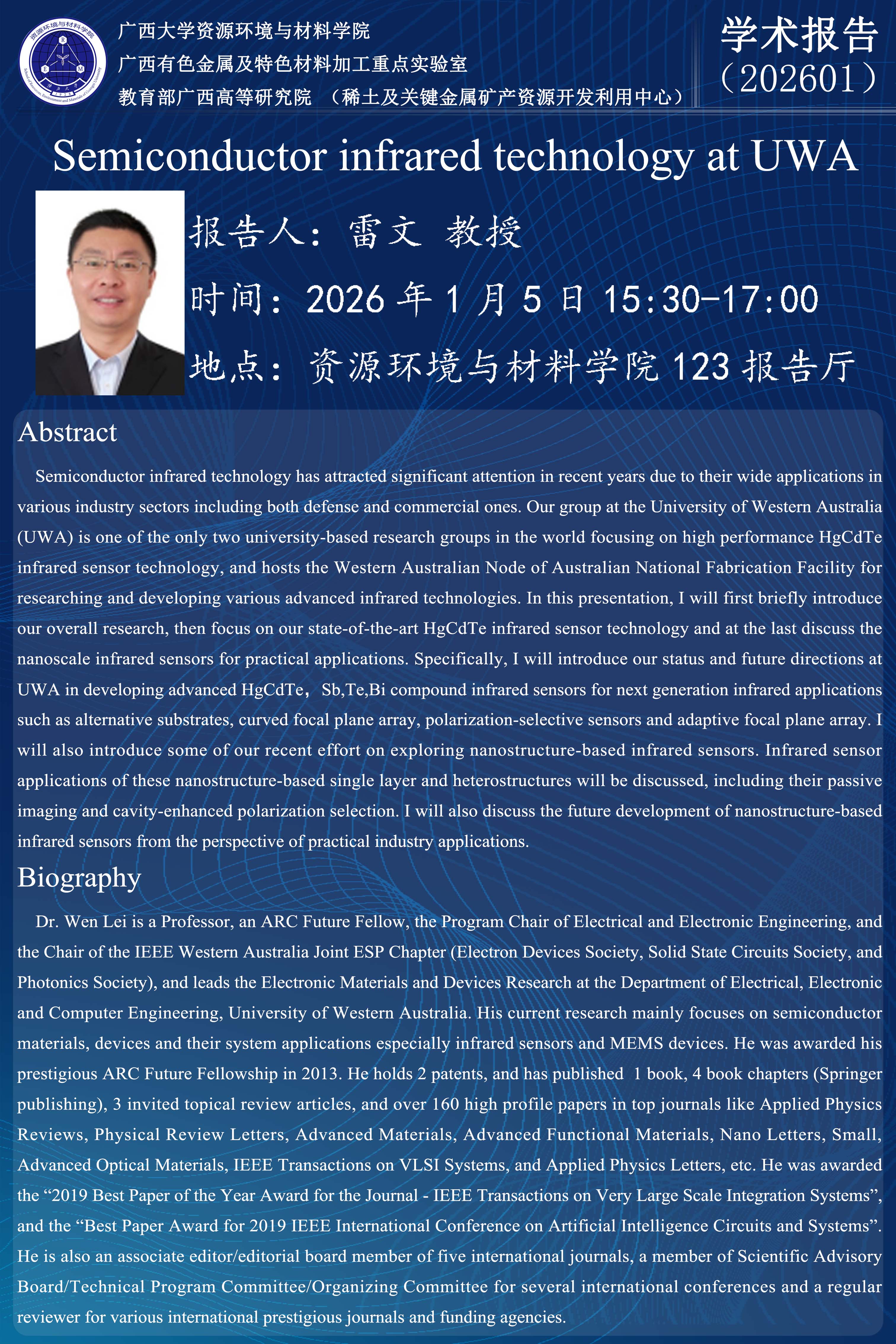 资源环境与材料学院学术报告:Semiconductor infrared technology at UWA