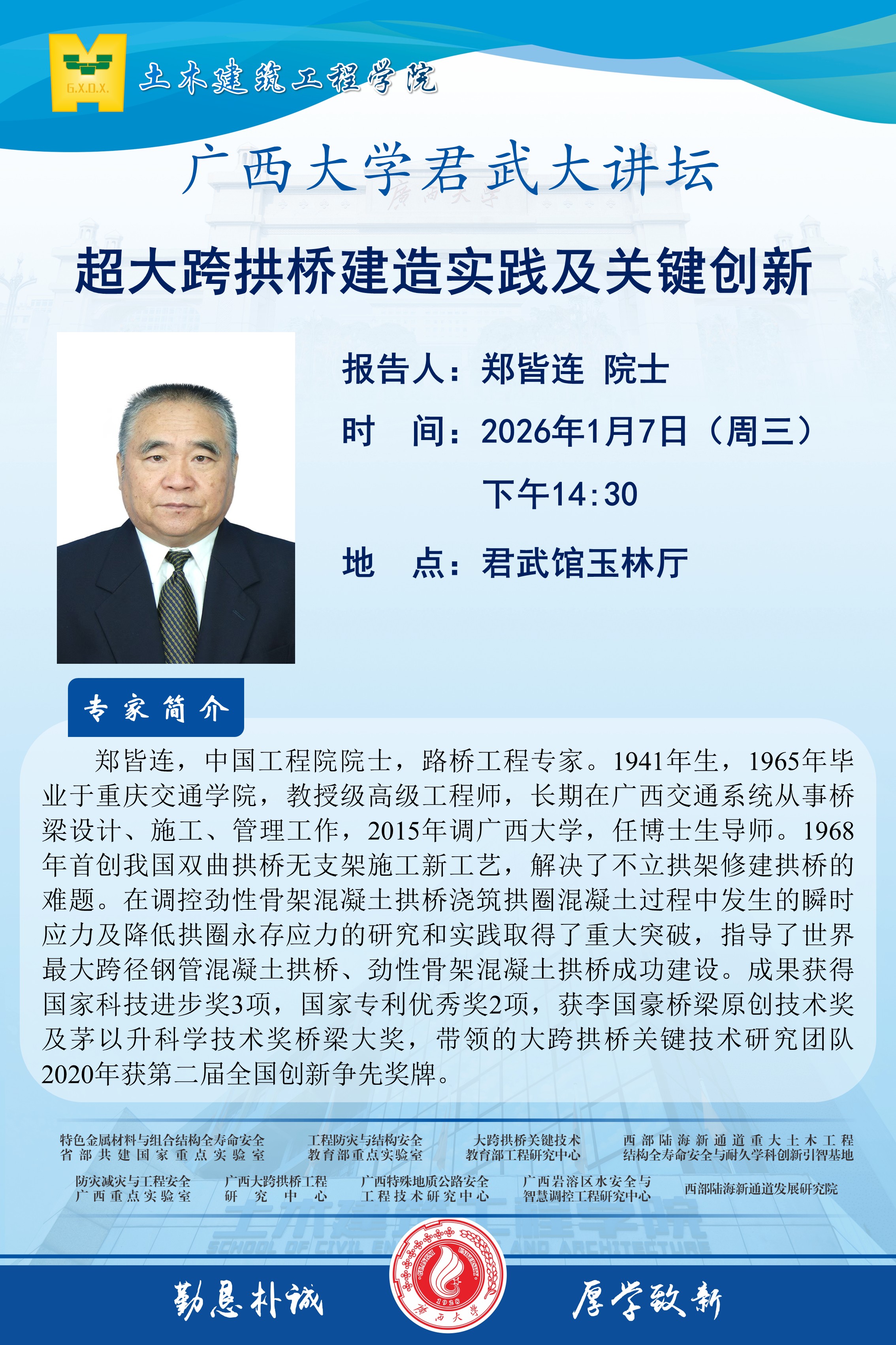 君武大讲坛、土木建筑工程学院学术报告:超大跨拱桥建造实践及关键创新