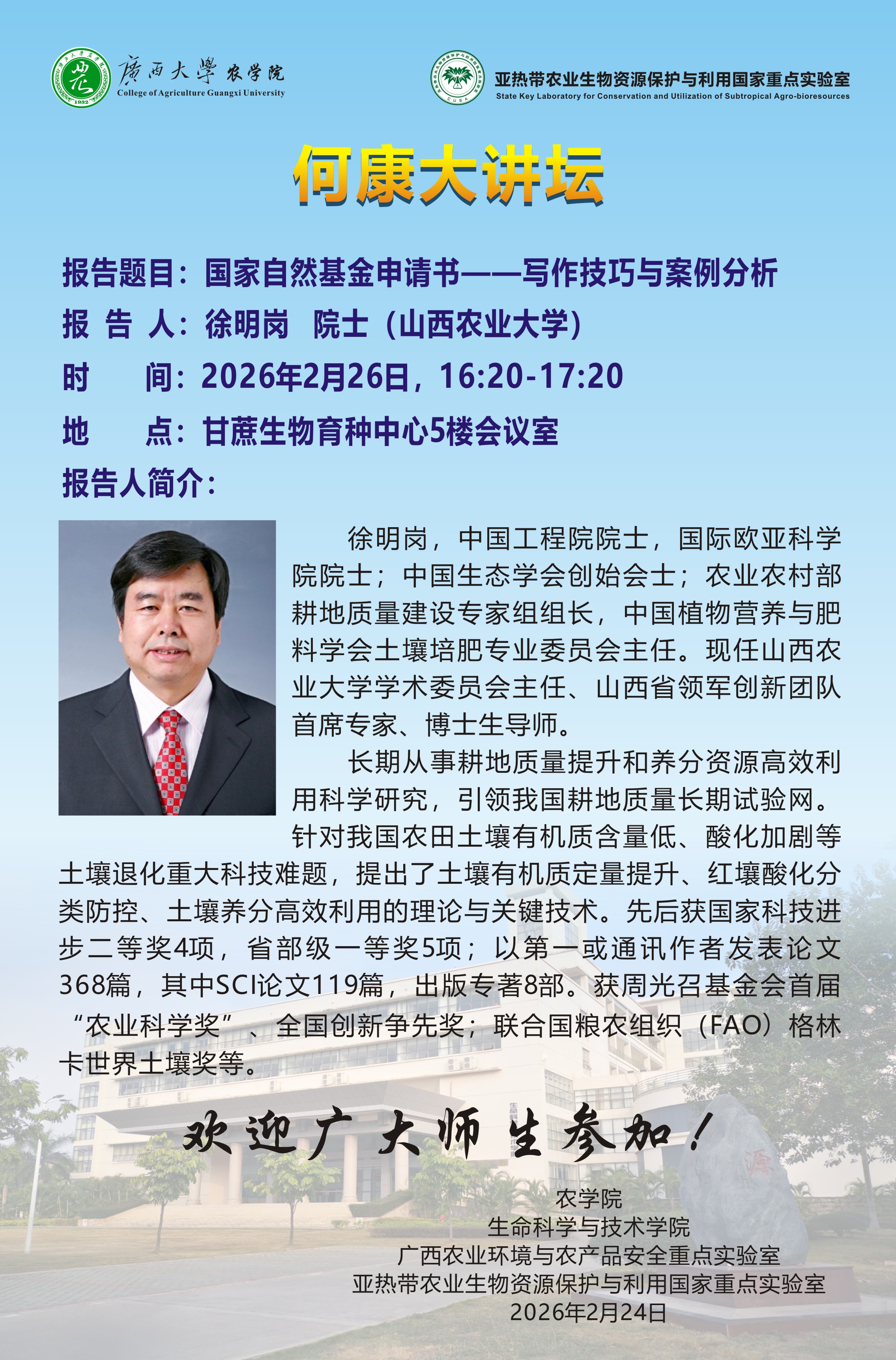 主讲人 徐明岗 院士 地址 甘蔗生育育种中心五楼会议室