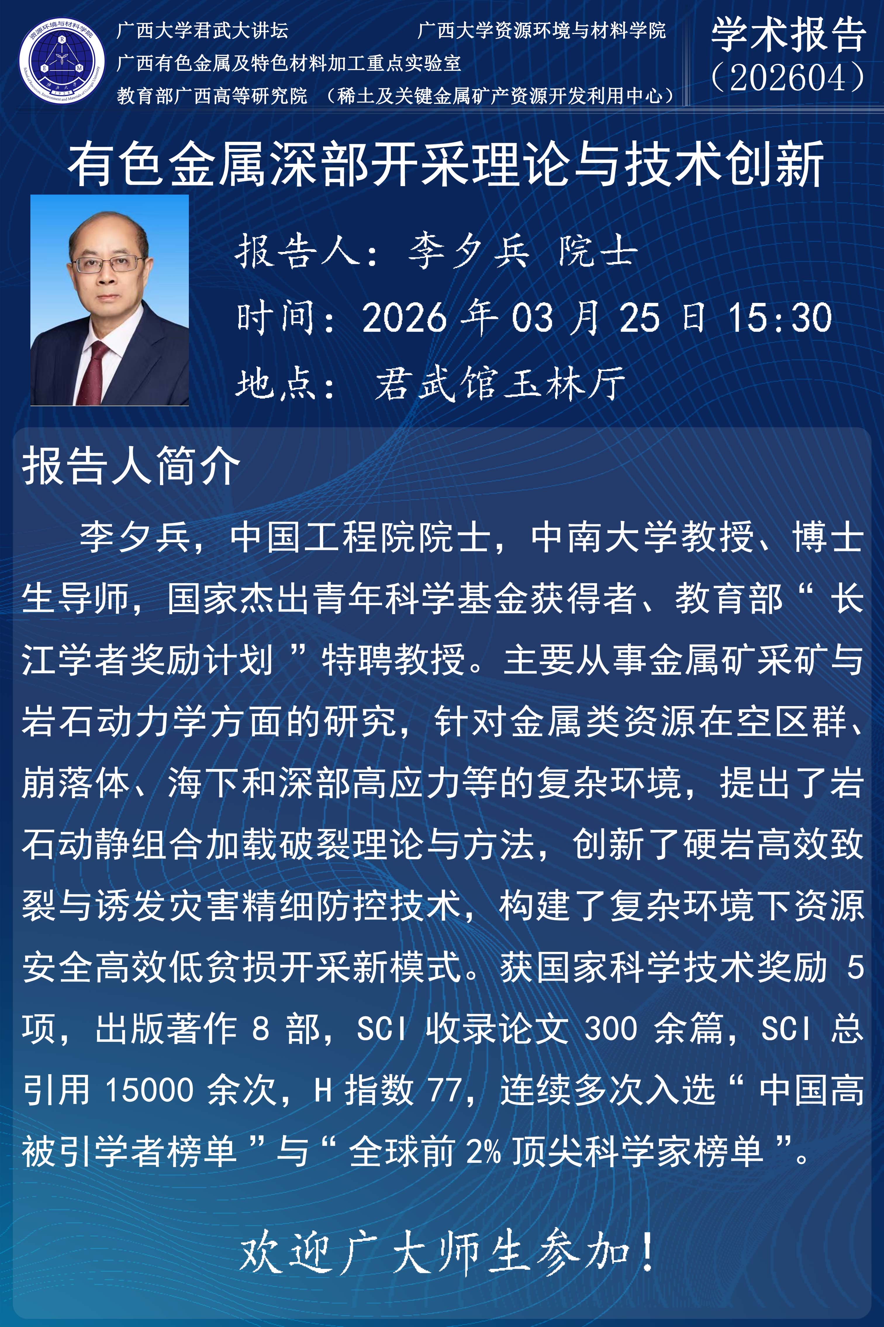 君武大讲坛、资源环境与材料学院学术报告:有色金属深部开采理论与技术创新