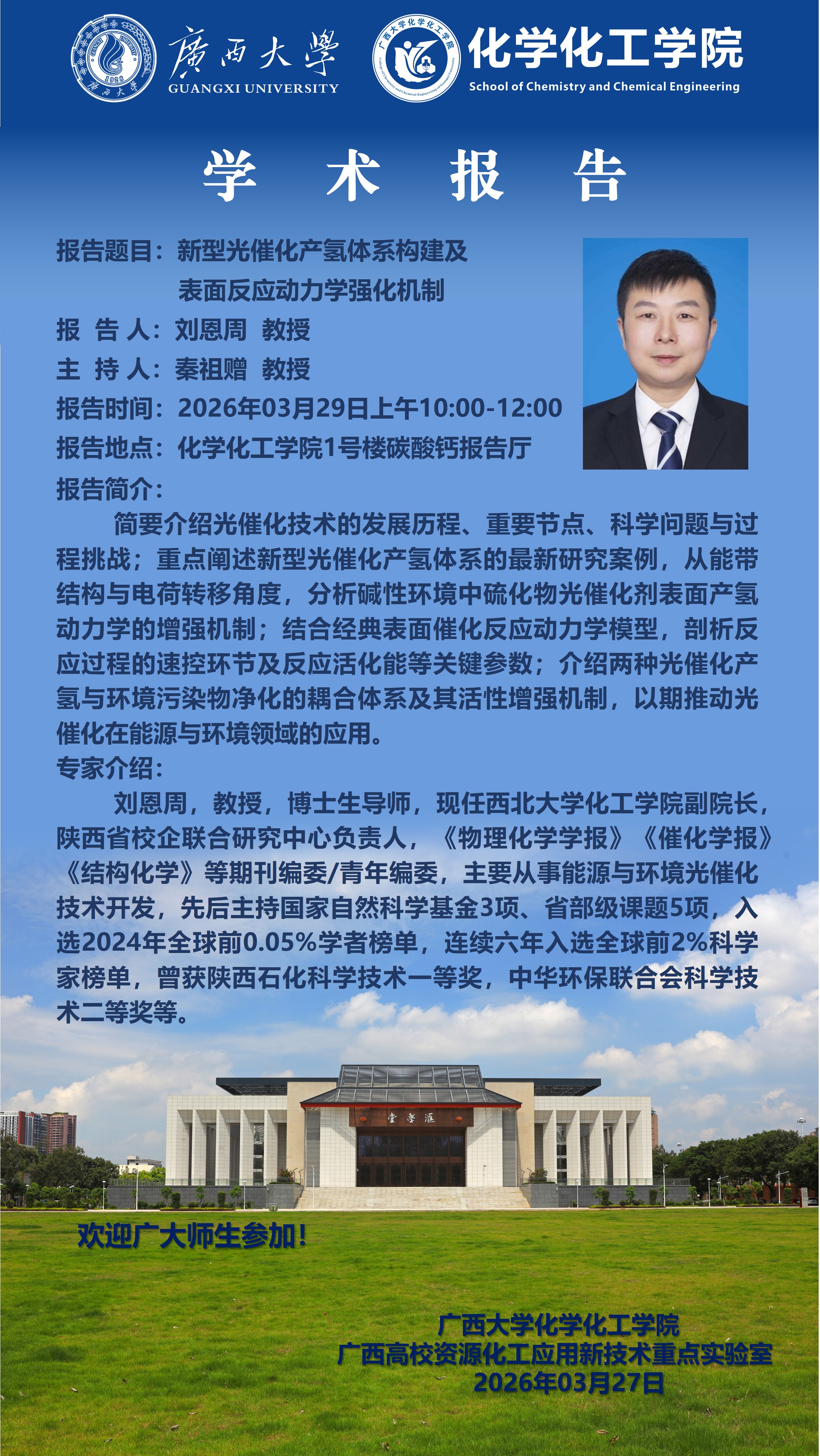 化学化工学院学术报告: 新型光催化产氢体系构建及表面反应动力学强化机制