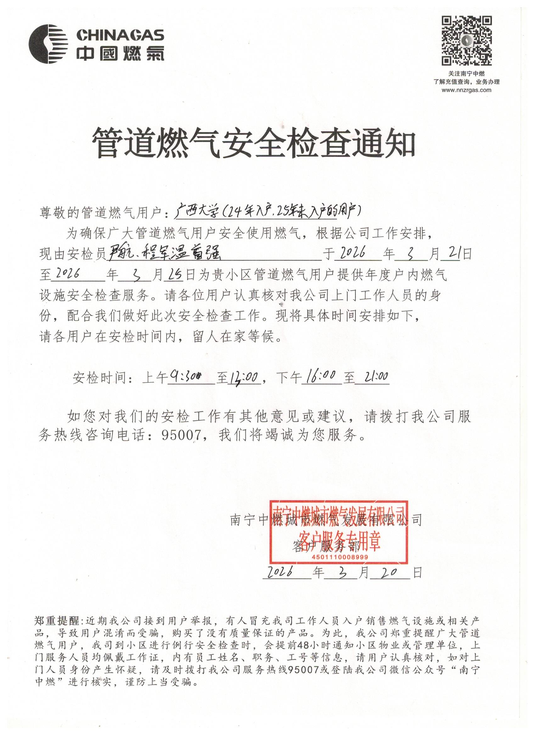 为保障校园用气安全,南宁中燃城市燃气发展有限公司将对2024—2025年期间未入户安检的管道燃气用户开展入户安全检查。请各位住户在此期间做好相关配合工作,现将具体通知如下: